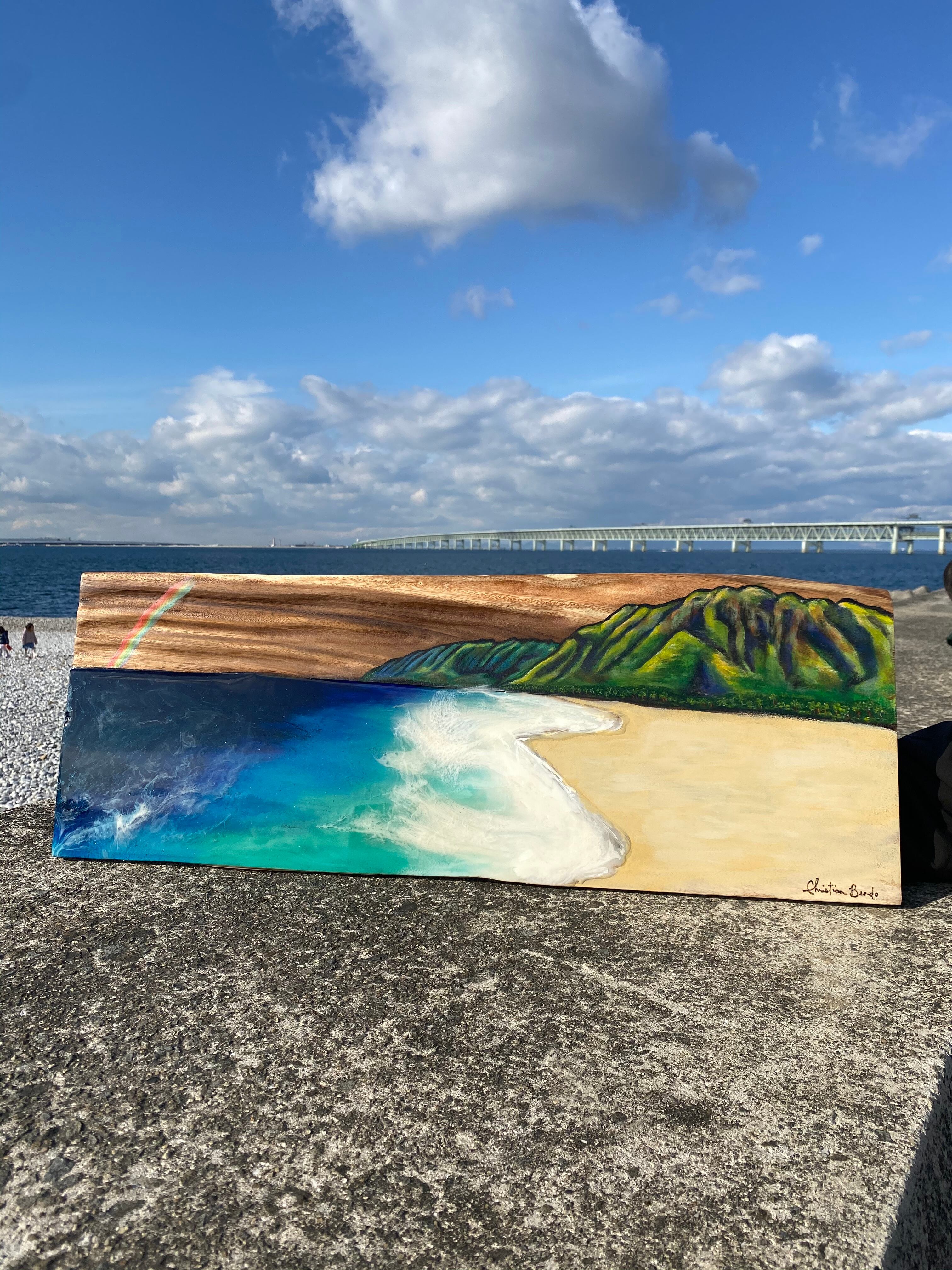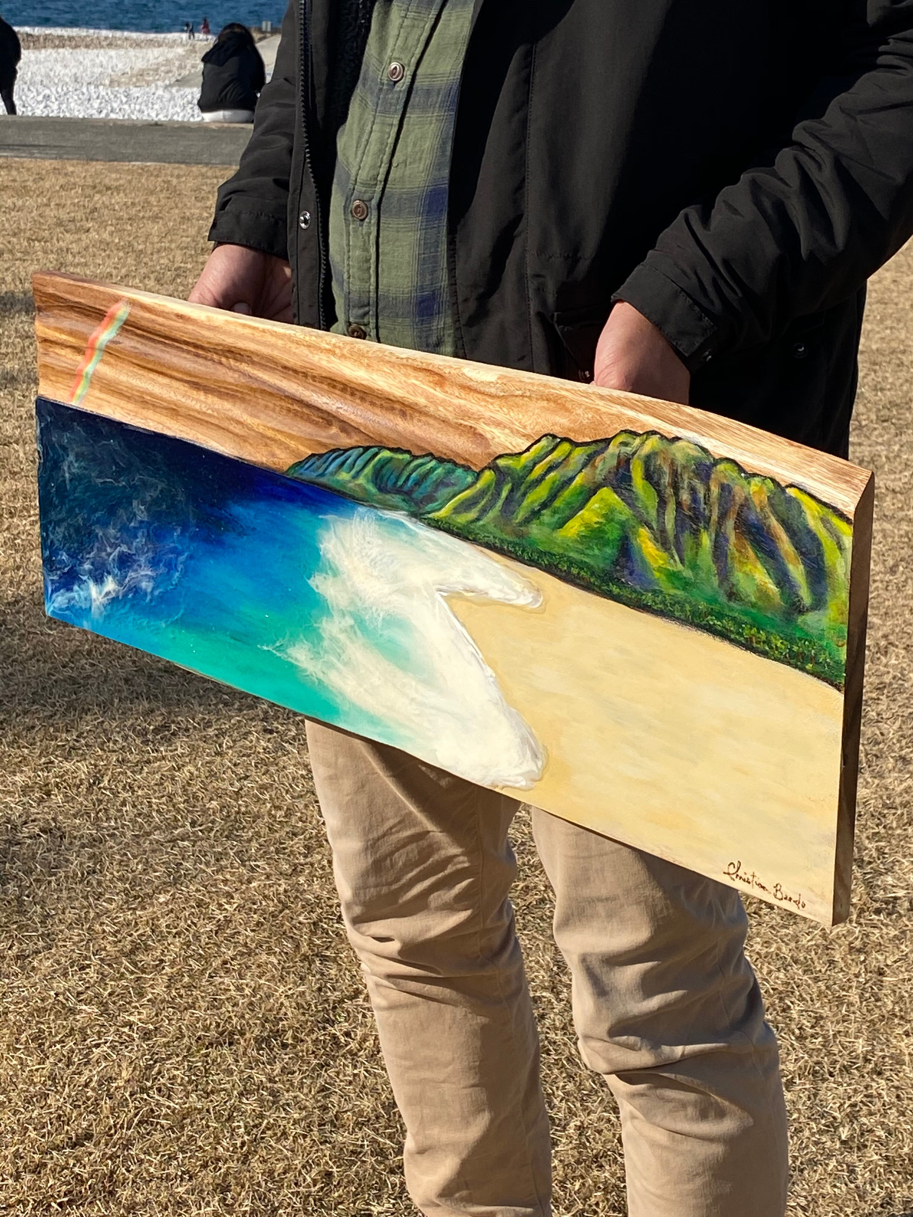 海を描いているエポキシ樹脂が光加減によって、輝いて見えたり、またダークな深海に見えたり、魅力ある一点物です。